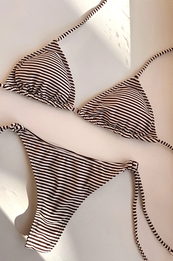 Bikini estampada triángulo con push up desmontable. Bombacha con tiras para atar, colaless