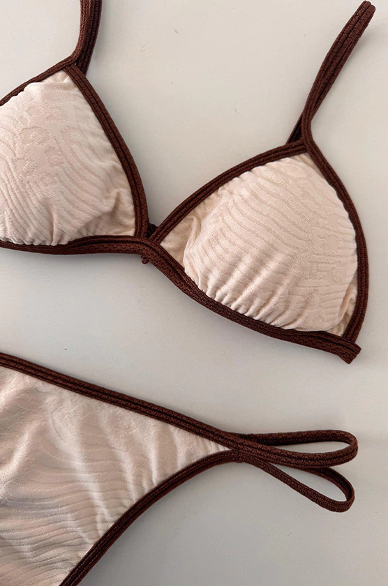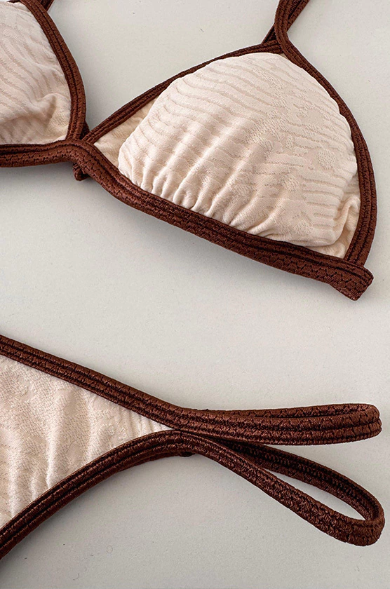 Bikini triangulo fijo con push up desmontable, lycra texturada color tiza con bordes chocolate texturado brilloso.