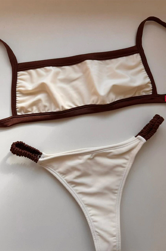 Bikini Top con bordes en colore chocolate brilloso, push up desmontable. Bombacha arruchada a los costados, semivedetina.